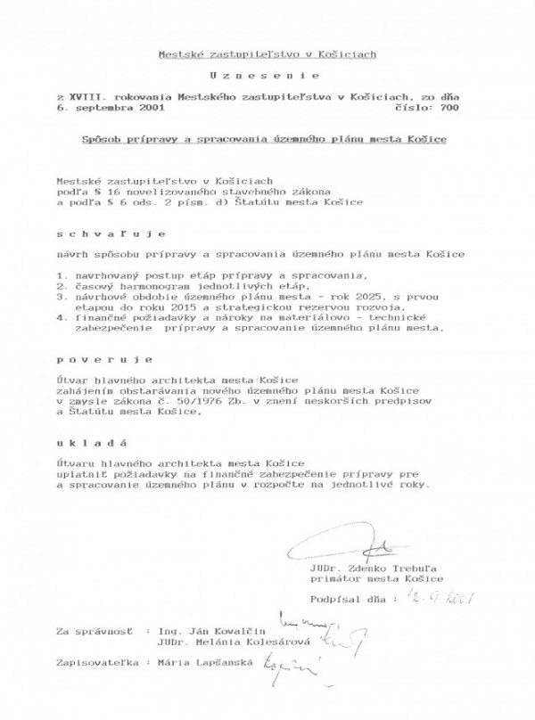 Uznesenie z XVIII. rokovania Mestského zastupiteľstva v Košiciach zo dňa 6.septembra 2001 číslo 700. Spôsob prípravy a spracovania územného plánu mesta Košice.